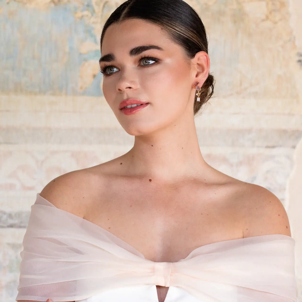 Los Pendientes Moitié juegan con las formas geométricas y los matices de color para crear una pieza moderna y equilibrada. Compuestos por una sucesión de piedras en distintos cortes, destacan por su composición vertical y ligera, que combina tonos suaves y destellos iridiscentes.