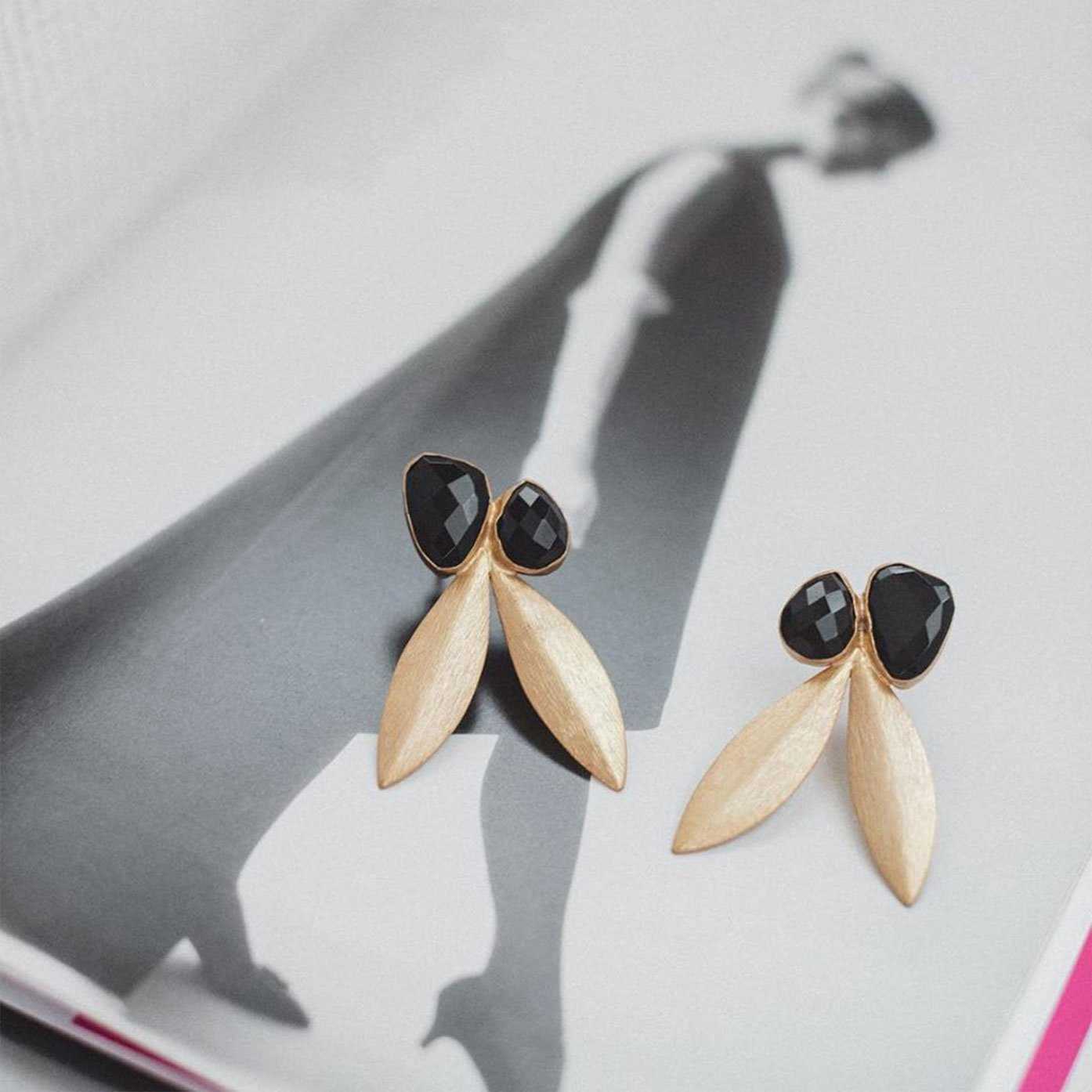Pendientes originales y elegantes con dos piedras de diferentes tamaños. Entre ellas, dos hojas alargadas separadas crean un efecto único. Este diseño innovador fusiona la armonía de la naturaleza con la sofisticación, añadiendo un toque distintivo a tu estilo.