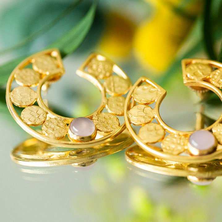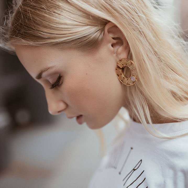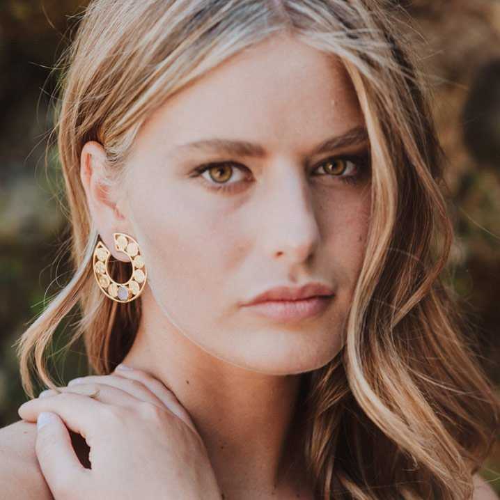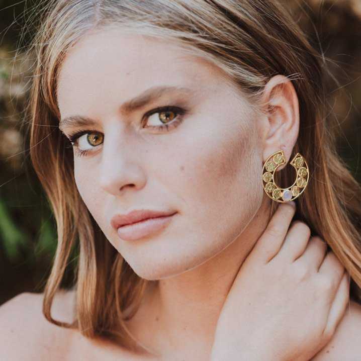 Pendientes en forma de rueda con pequeños círculos en su interior, uno de ellos con una piedra natural