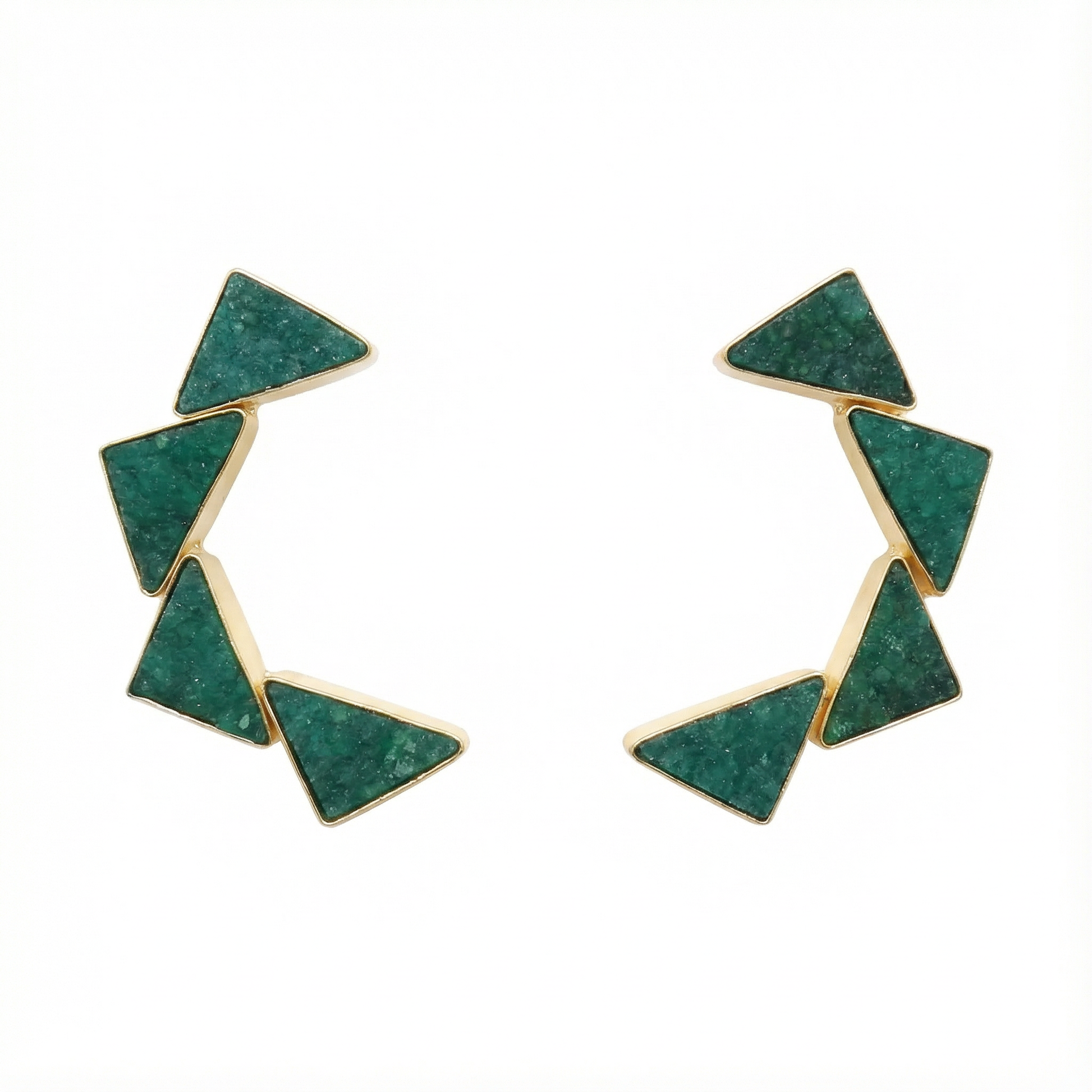 Estos cautivadores pendientes presentan piedras en forma de pequeños triángulos dispuestos de manera armoniosa, creando un encantador semicírculo. Un diseño único que añade un toque de originalidad y estilo a tu look, destacando con gracia en cualquier ocasión.