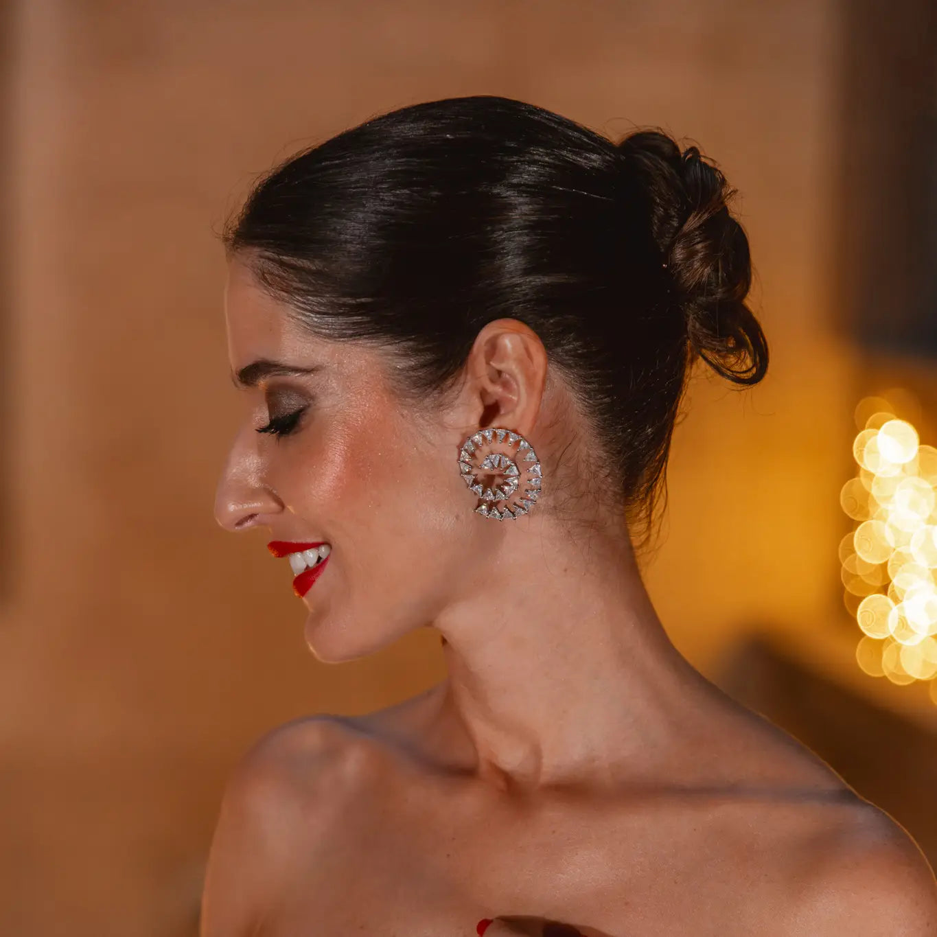 La disposición en espiral de los triángulos crea un efecto visual dinámico y llamativo, ideal para quienes buscan un accesorio que combine estilo y distinción. Perfectos para cualquier ocasión, los pendientes Reata son una opción versátil y chic que realza la belleza natural de quien los lleva.