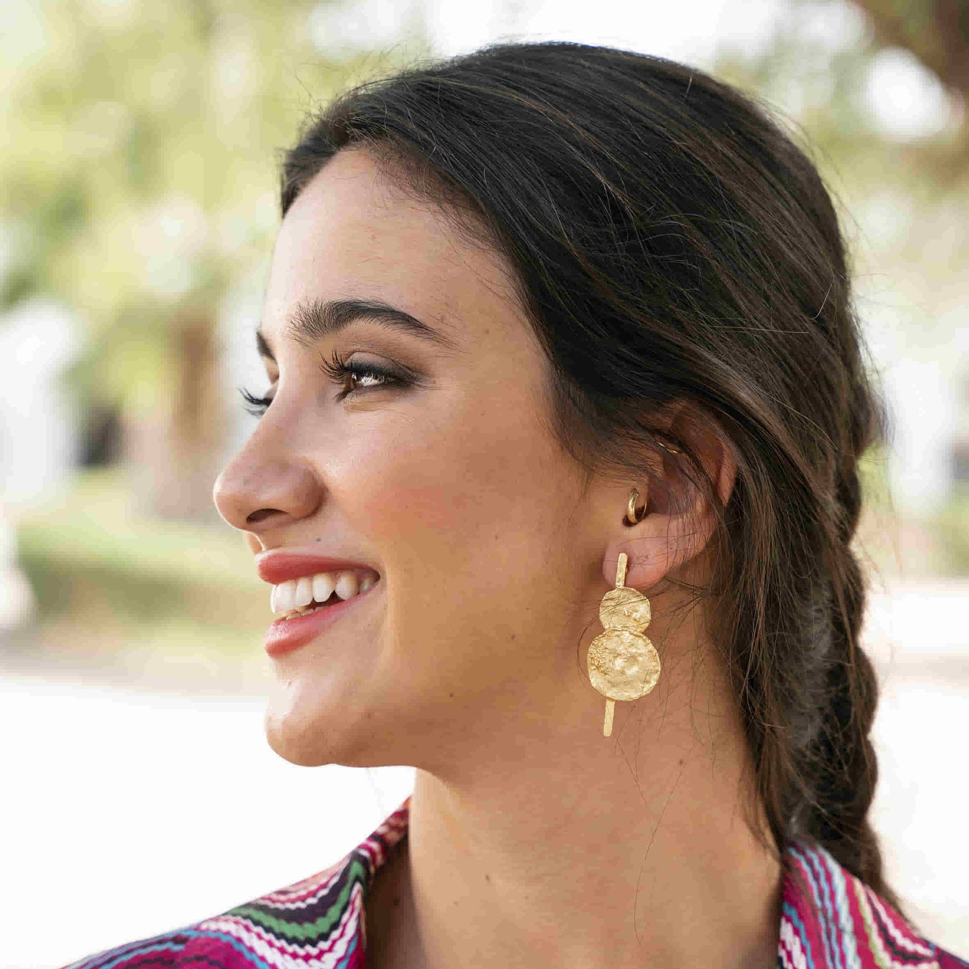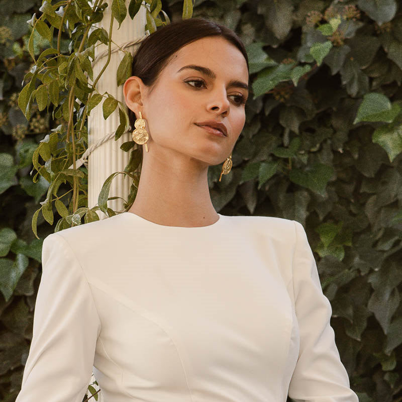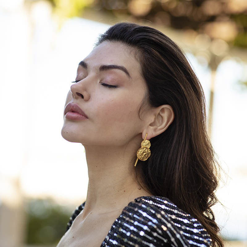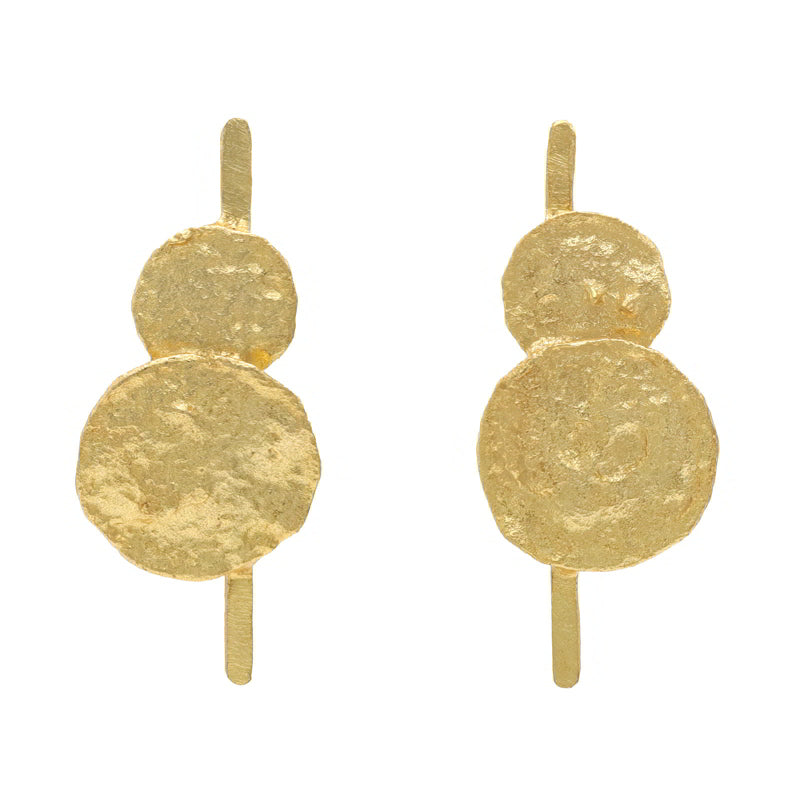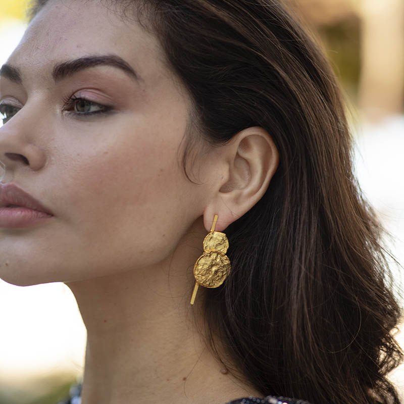 Dos superficies redondas con relieve se unen verticalmente en estos elegantes pendientes. Un diseño distintivo que aporta sofisticación y estilo a tu look. Realza tu elegancia con esta joya única.