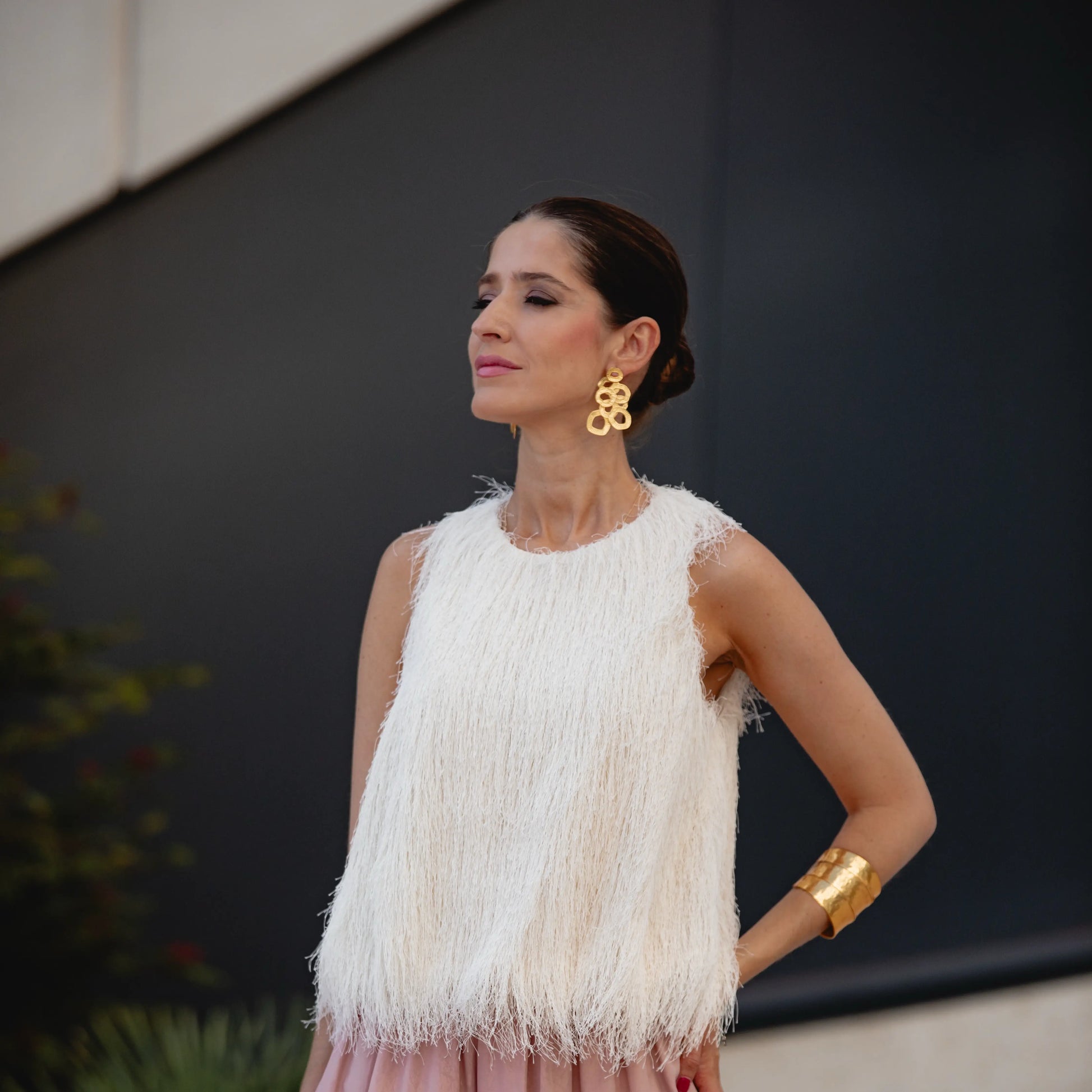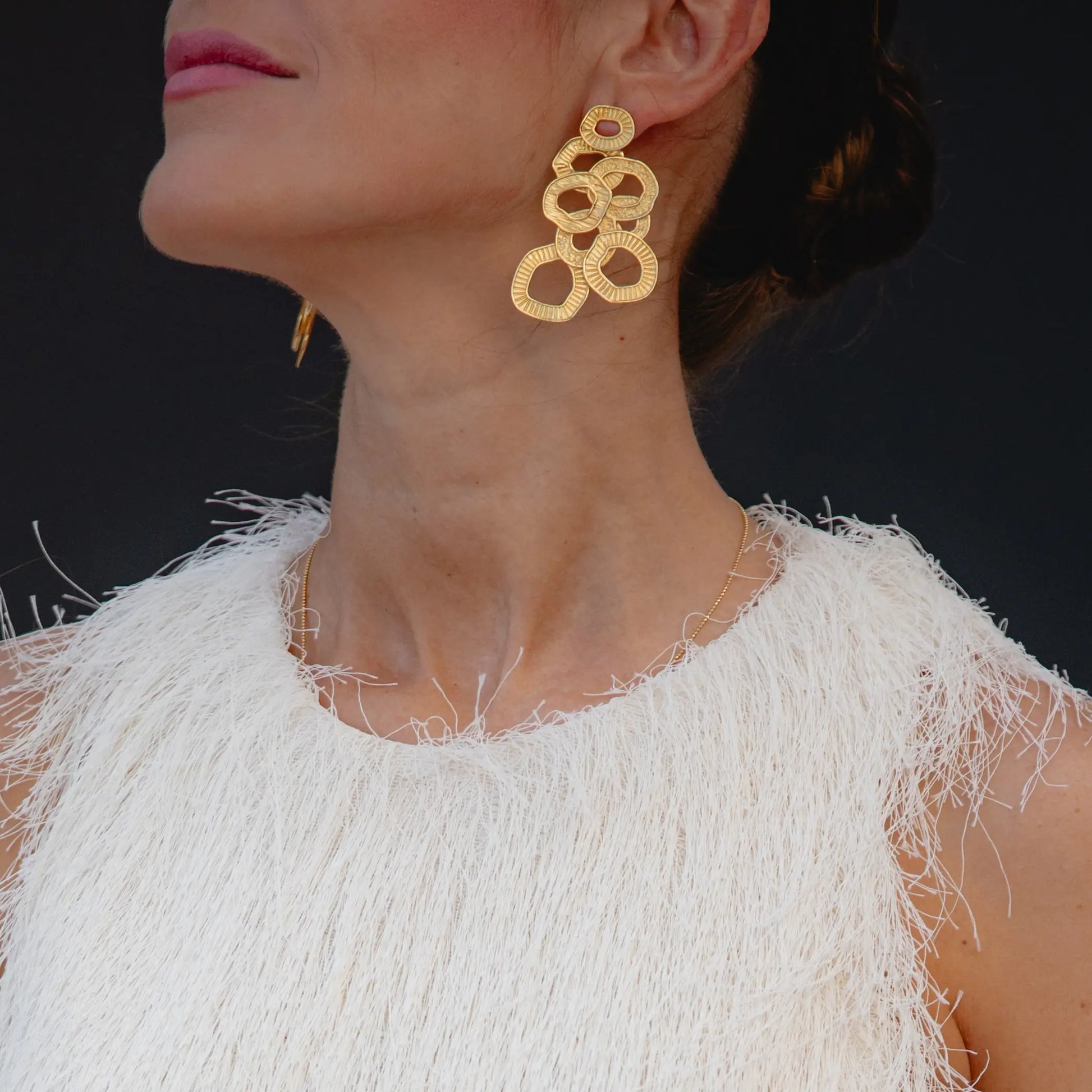 Estos pendientes están diseñados con varias circunferencias texturizadas que se superponen de manera artística, formando un conjunto que evoca la forma de una pirámide. La textura en cada circunferencia añade profundidad y detalle, creando un efecto visual intrigante y dinámico. Este diseño innovador no solo resalta la modernidad de los pendientes, sino que también les otorga un aire elegante y sofisticado. Ideales para quienes buscan un accesorio distintivo y contemporáneo, estos pendientes son perfectos para realzar cualquier atuendo, desde looks casuales hasta ocasiones más formales, aportando un toque de originalidad y estilo.