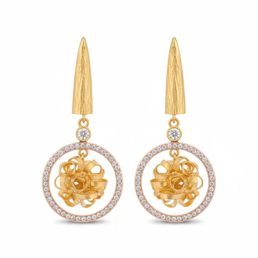 Descubre estos pendientes que combinan una elegancia única con un diseño lleno de movimiento y textura. La forma alargada y ligeramente curva de la base invita a un ligero deslizamiento sobre la piel, mientras que el aro circular que cuelga enmarca una original maraña de finas líneas retorcidas que recuerdan la delicadeza de un lazo despeinado. Al llevarlos, transmiten ligereza y frescura, aportando un toque sofisticado sin esfuerzo.