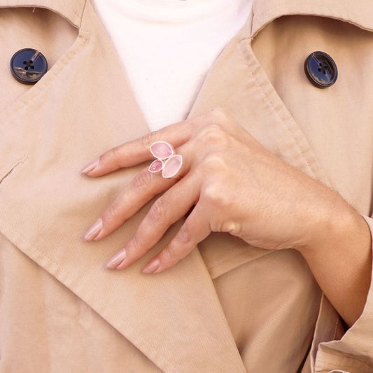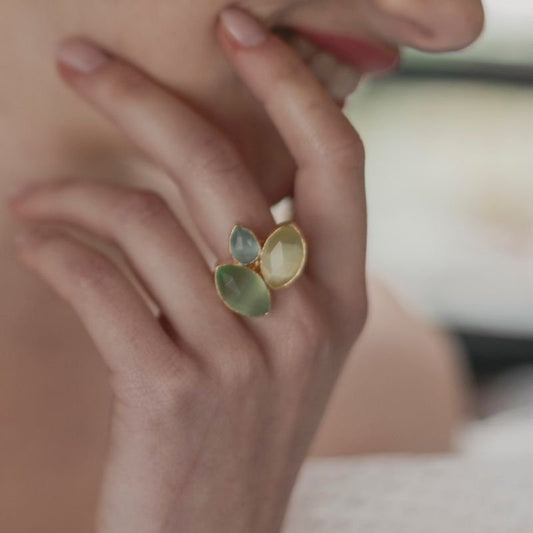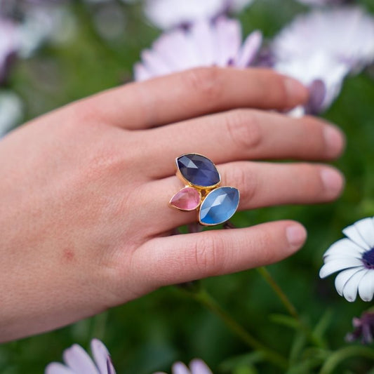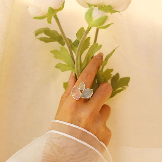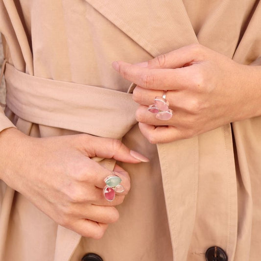 Anillo Grayas Rosa cuarzo. Azul y Verde agua