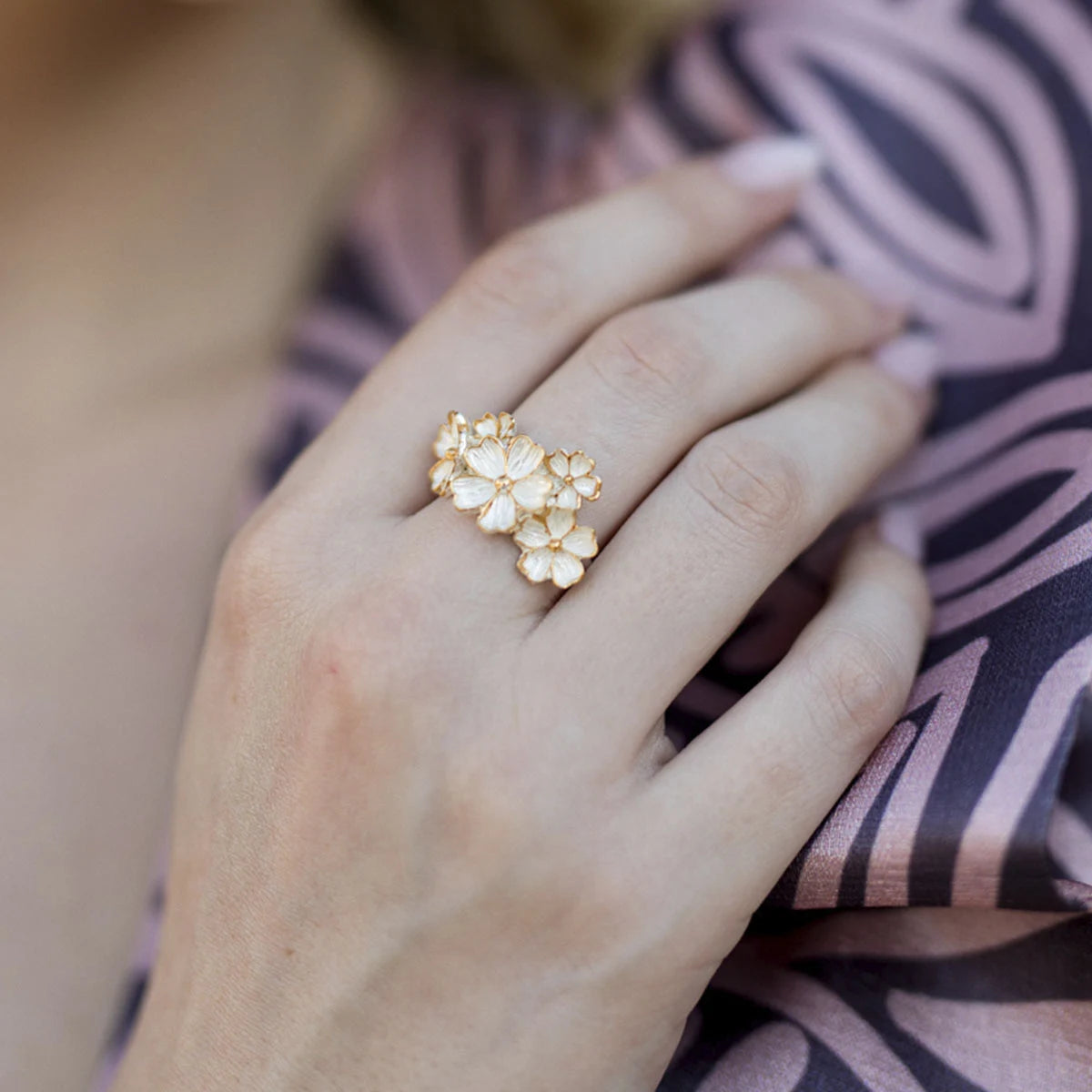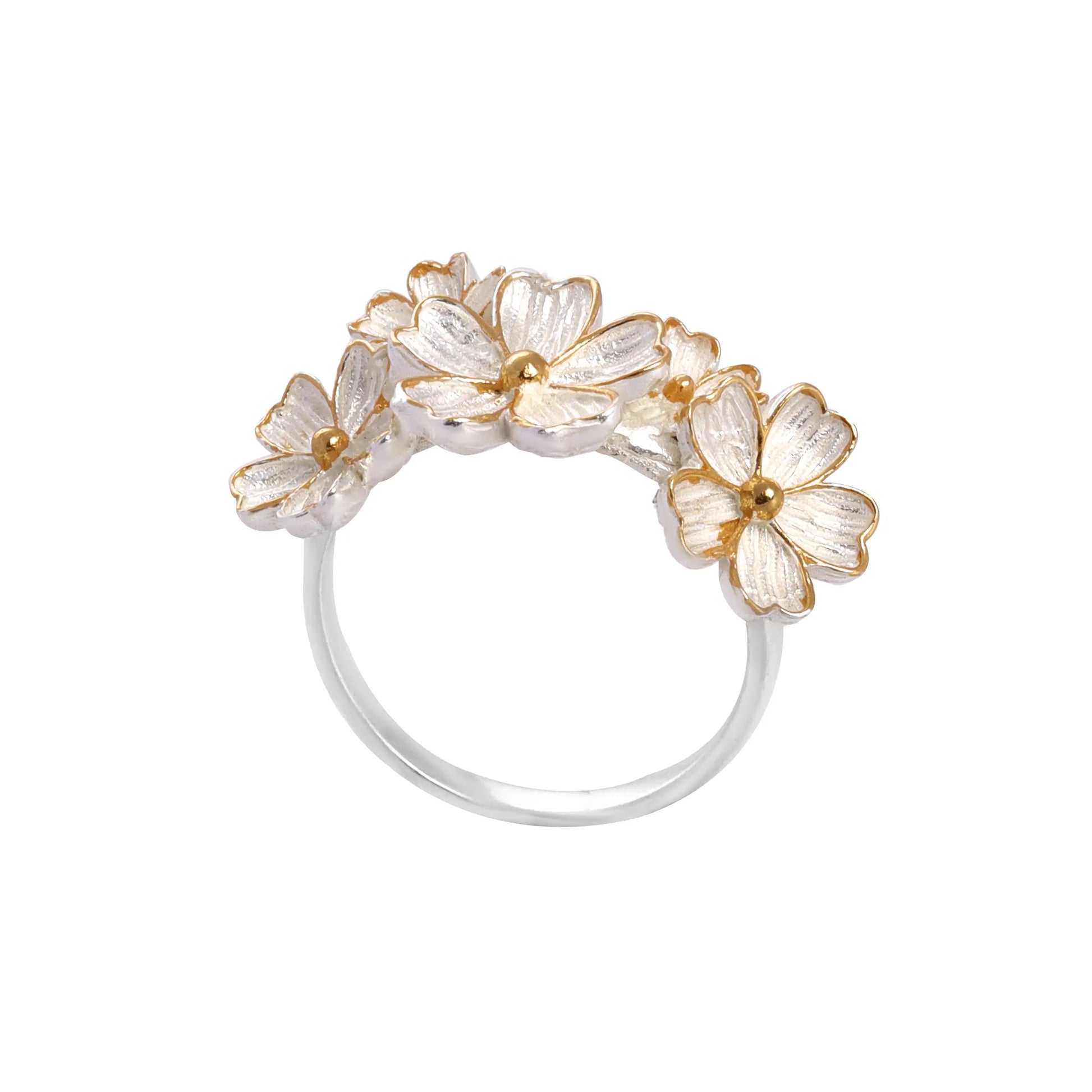 Este anillo está decorado con un delicado conjunto de flores que rodean la parte superior de la pieza. Las flores, con detalles dorados en el centro, tienen un acabado texturizado que resalta su aspecto natural y femenino. La combinación de colores en la plata y los toques dorados crea un contraste sutil y elegante, haciendo de este anillo una opción ideal para quienes buscan un diseño romántico y lleno de detalles que evocan la naturaleza.