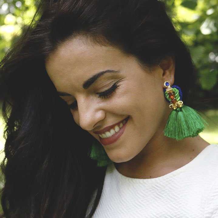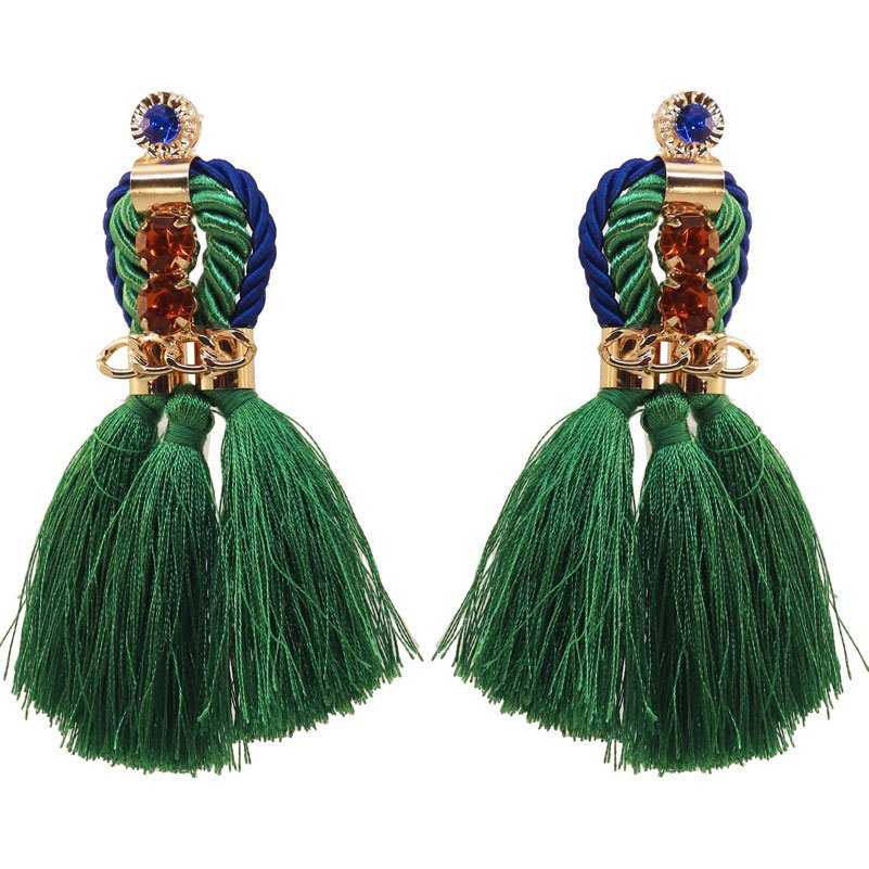 | Pendientes con flecos verde con cordón azul y verde, cristales en azul y naranja y fondo dorado. |