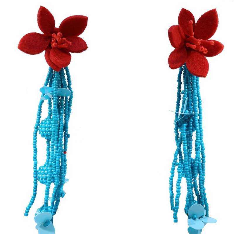 Pendientes con una flor de fieltro y abalorios en la parte superior y abalorios y cuentas en finas tiras que descienden desde la flor.