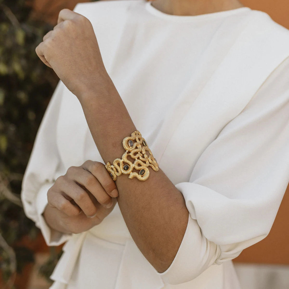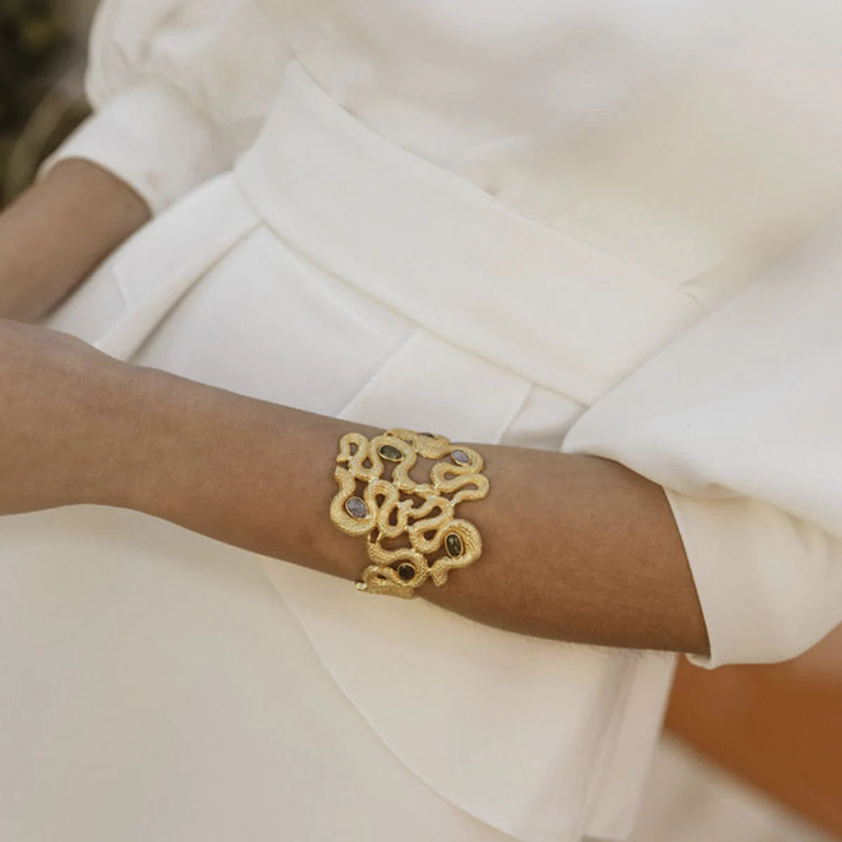 Esta pulsera es una declaración de estilo en sí misma, diseñada para mujeres que buscan accesorios con personalidad y carácter. El entrelazado de serpientes crea un efecto escultural y vanguardista, mientras que las piedras ovaladas añaden un toque de color y sofisticación, elevando cualquier outfit. Perfecta para combinar con prendas minimalistas y dejar que el diseño sea el centro de atención, o para complementar looks atrevidos y llenos de actitud.