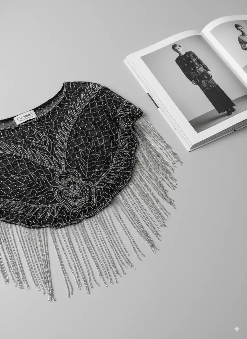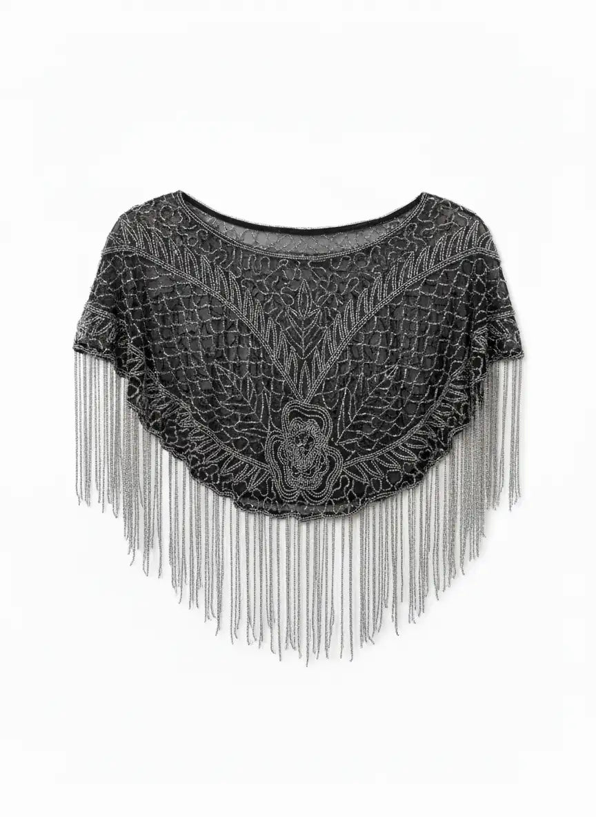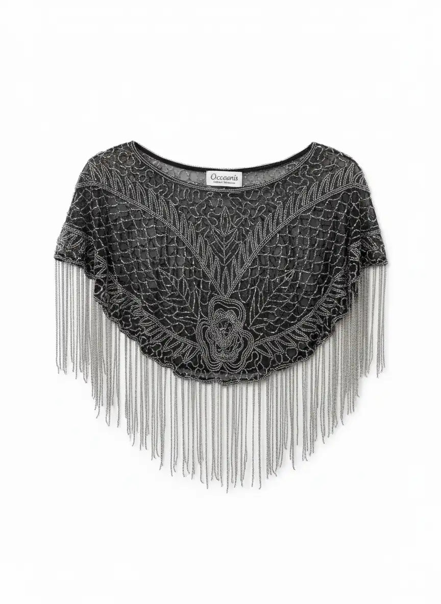 La capa joya Nuit destaca por su diseño elegante y equilibrado. Su caída ligera y silueta fluida envuelven la figura con movimiento y delicadeza, aportando un toque de sofisticación.