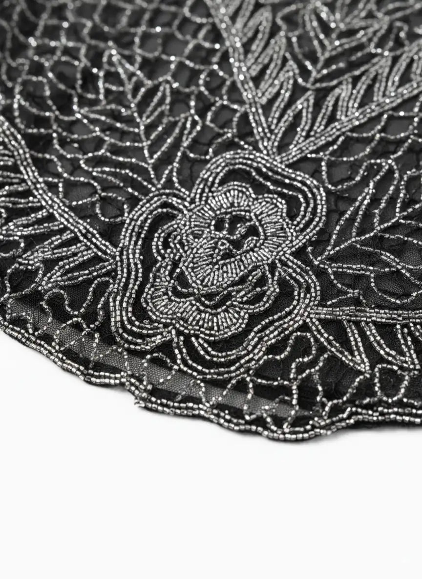 Las cuentas están dispuestas de manera simétrica en la parte delantera y trasera, y en la parte central inferior se forma una flor que añade un detalle especial y llamativo. Este patrón convierte la prenda en una pieza única y armoniosa.