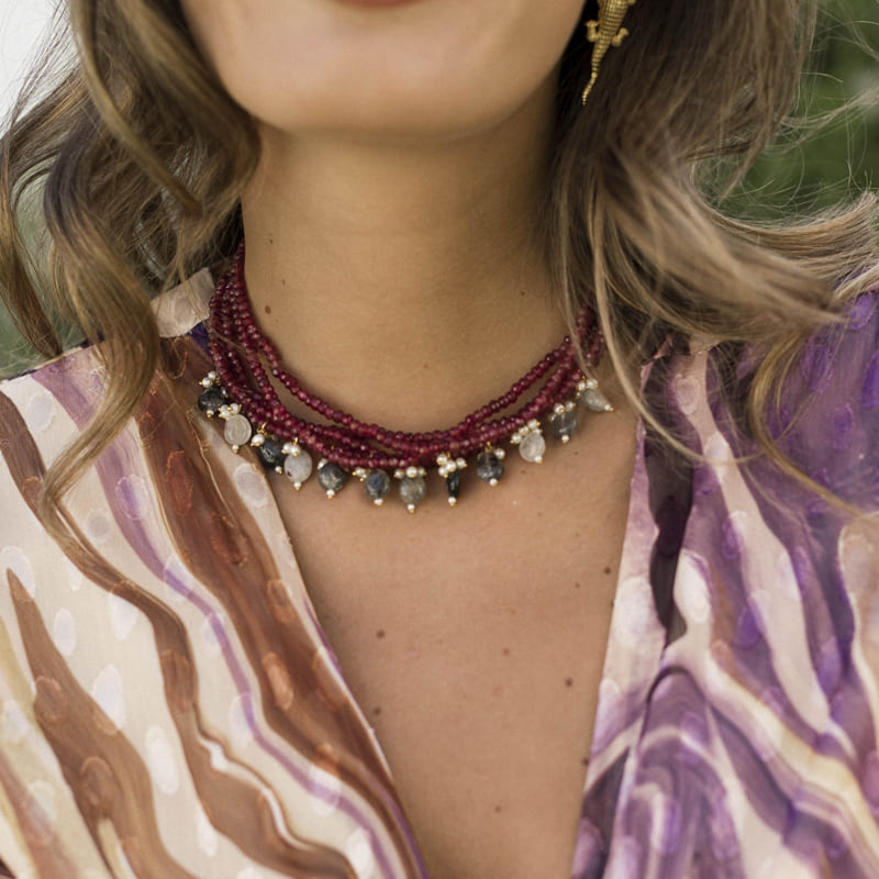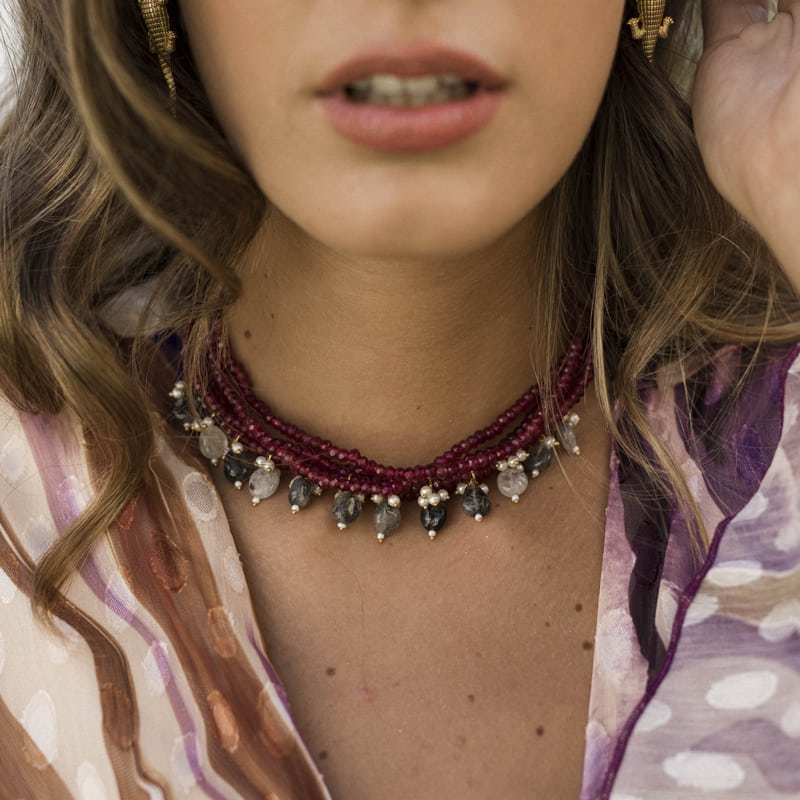 Choker formado por cinco hileras de piedras y algunas que cuelgan de la última inferior
