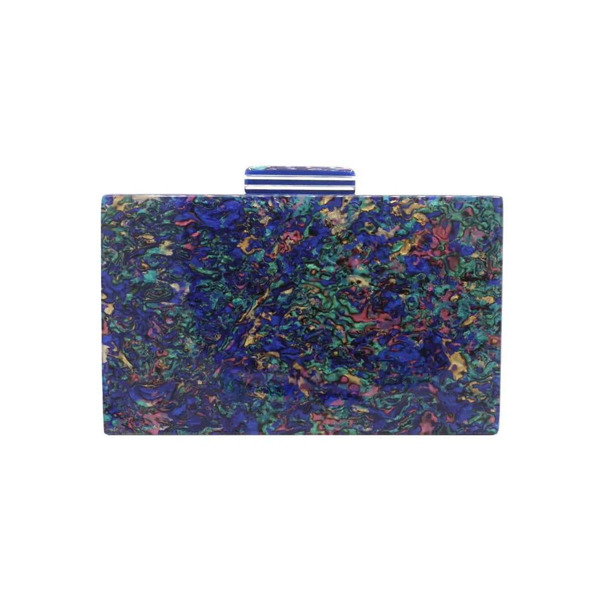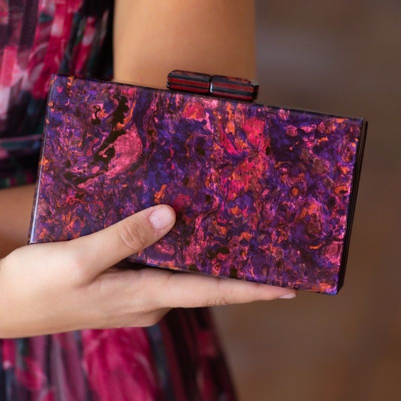 Cartera de mano en acrílico marmoleado con diferentes tonalidades. Se puede llevar de mano o con la cadena.