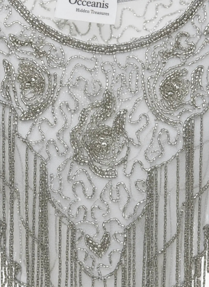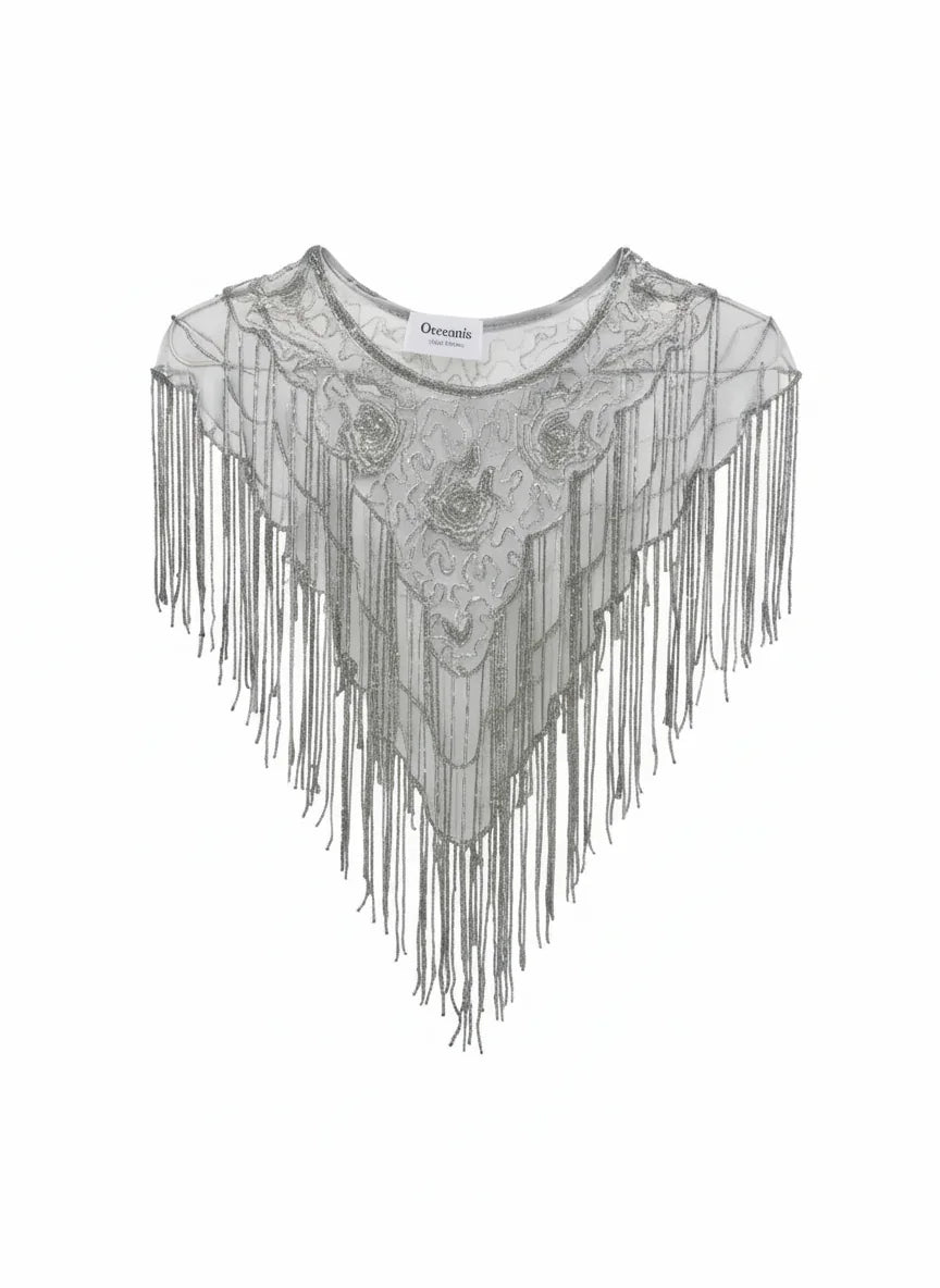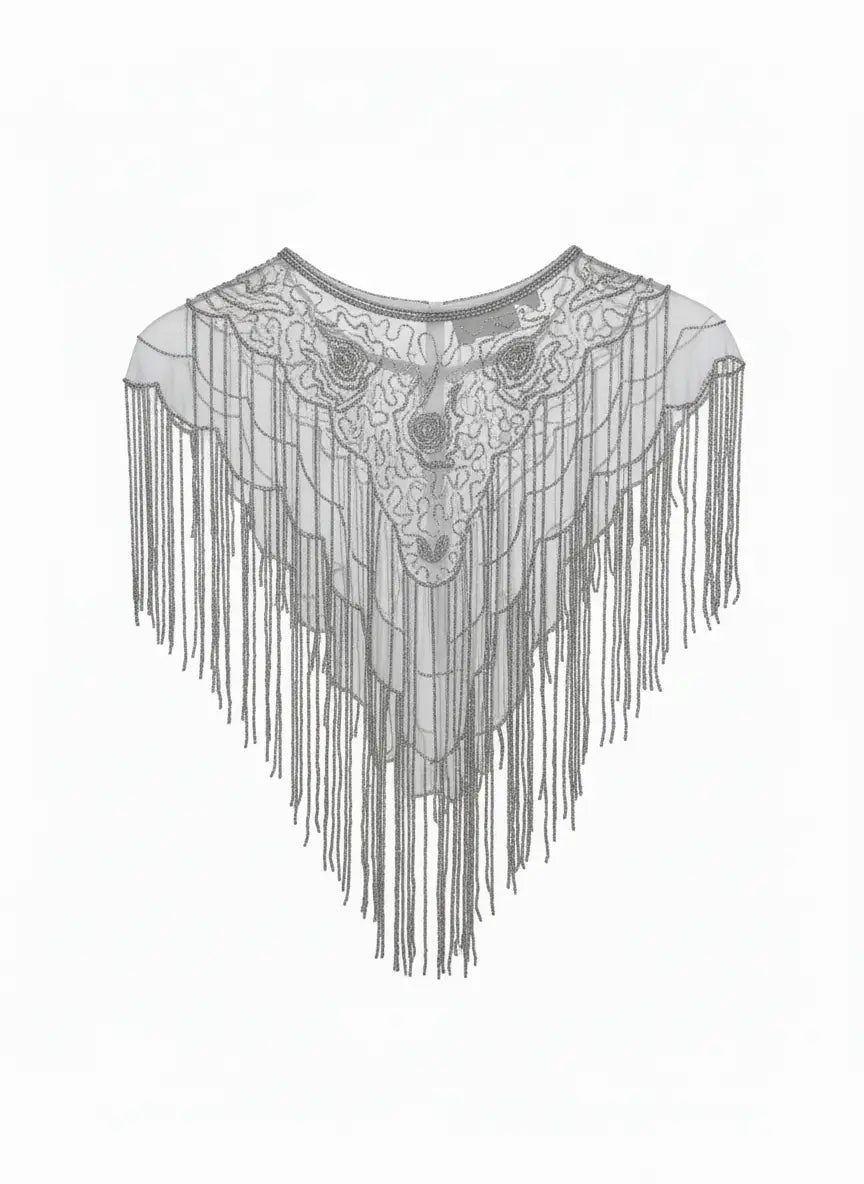 El Cuello Joya Esencia es una pieza larga con forma de pico que aporta fuerza y presencia a cualquier conjunto. Su diseño envolvente realza el escote de manera elegante y sofisticada.