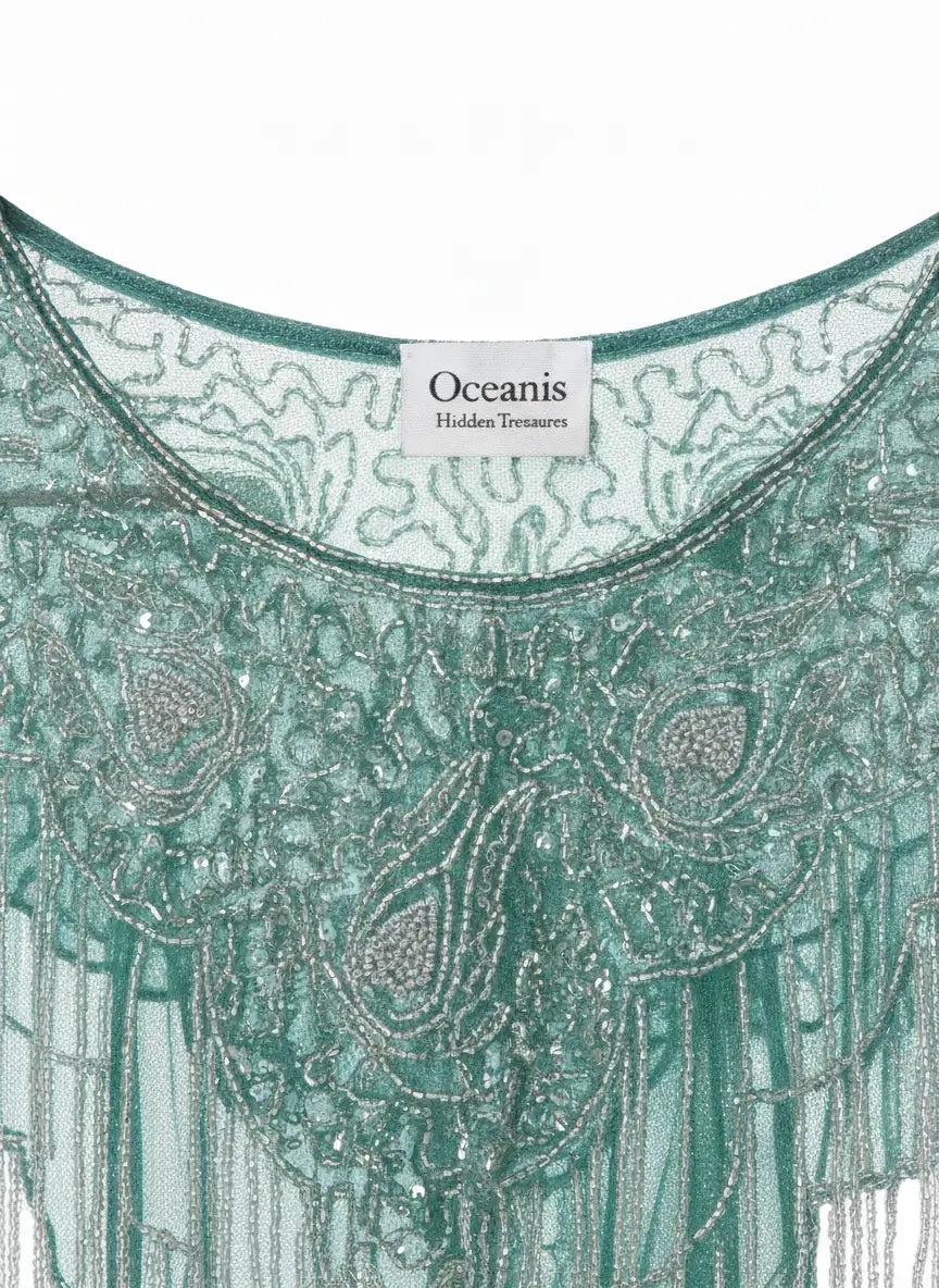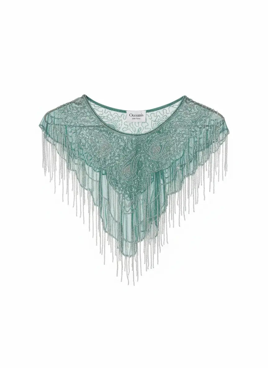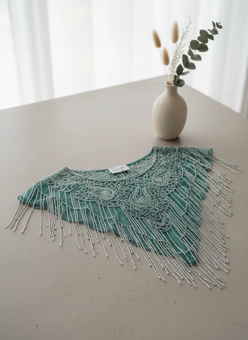 El Cuello Joya Esencia es una pieza larga con forma de pico que aporta fuerza y presencia a cualquier conjunto. Su diseño envolvente realza el escote de manera elegante y sofisticada.