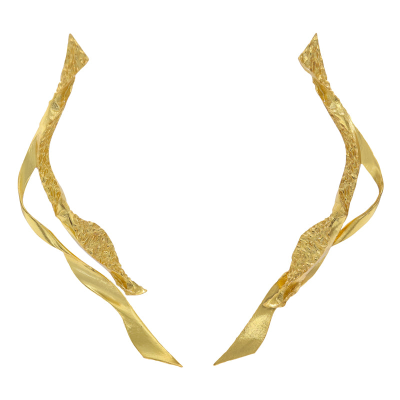Pendientes en forma de línea aplanada y retorcida que trepa un poco por la oreja a la vez que cae su otro extremo. Un modelo de corte super actual perfecto si quieres romper con las lineas clásicas de tus looks más especiales de invitada o para eventos. Atrévete con ellos también para looks más informales y aporta un toque de luz y brillo que no pasará desapercibido.