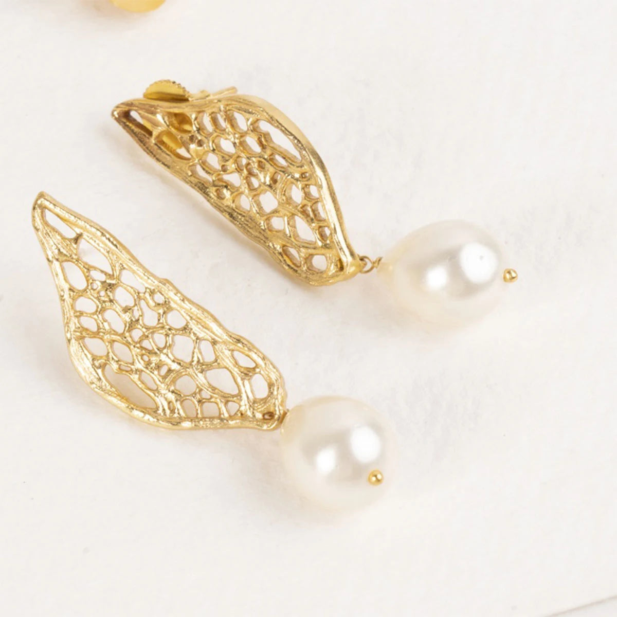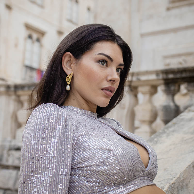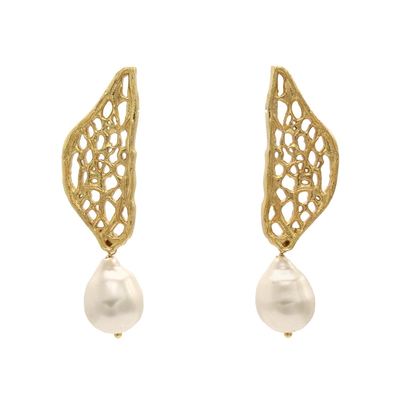 Pendientes formados por una superficie calada con una piedra colgante en su parte inferior. Un pendiente de estilo atemporal perfecto para añadir luz y movimiento a tus looks, ideal para tus looks de invitada.