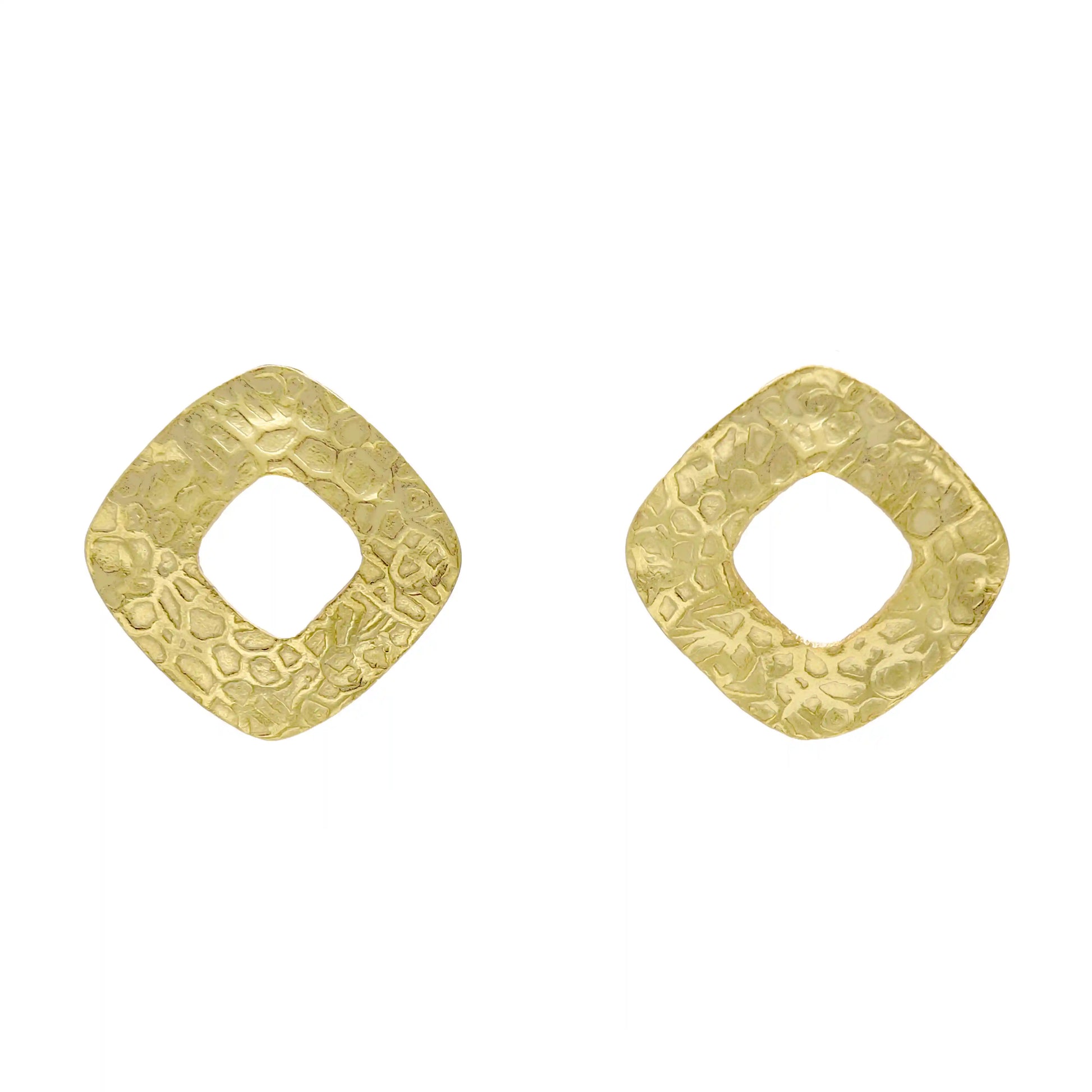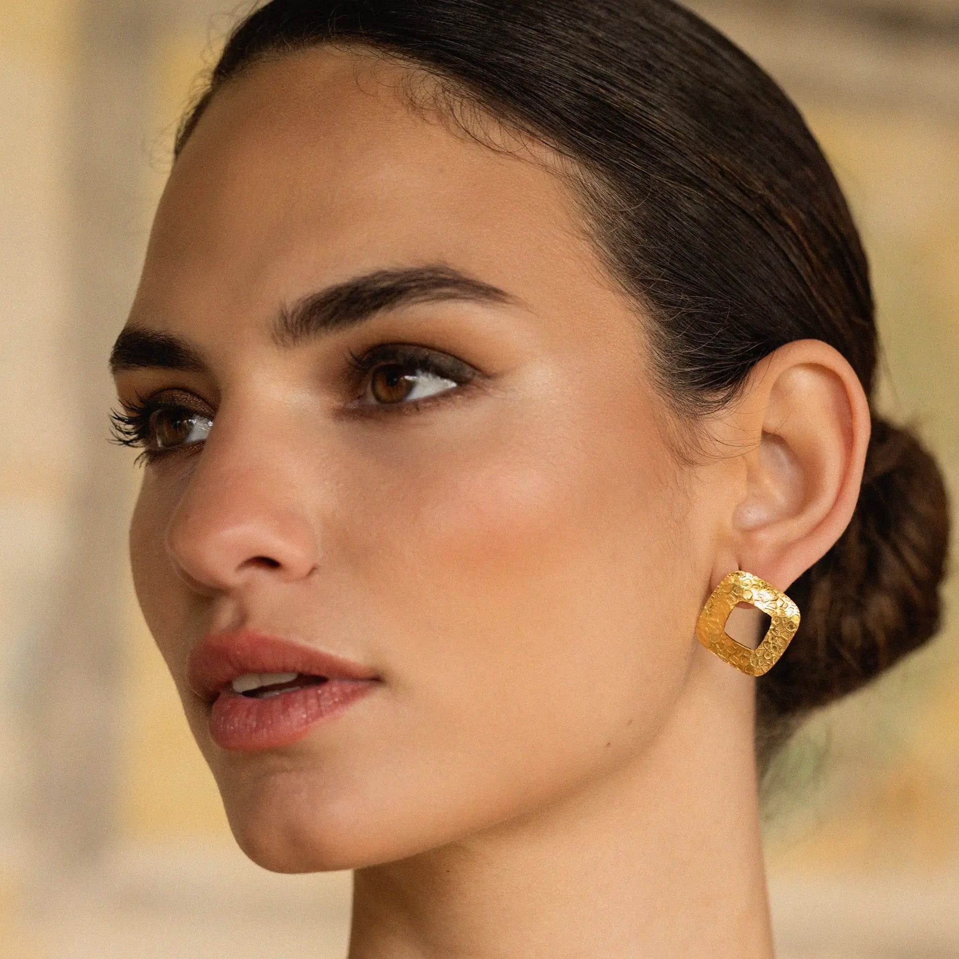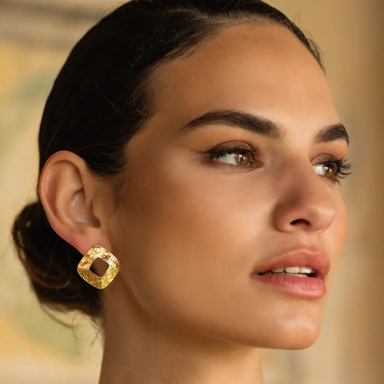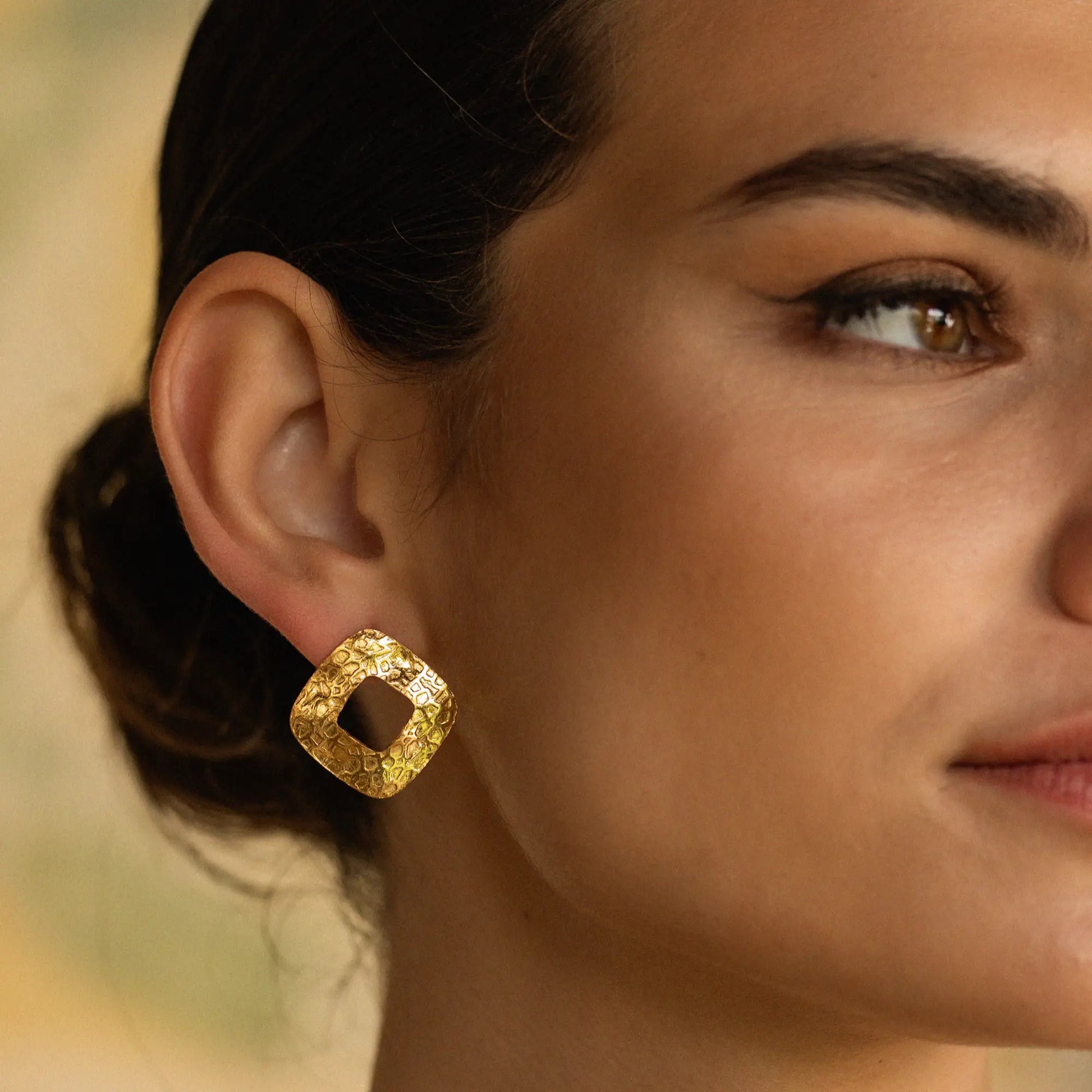 Esta pieza única de joyería es una verdadera celebración de la forma y la textura. Con su diseño cuadrado ligeramente curvado y un vacío central, recuerda a una obra de arte moderna que combina simplicidad y sofisticación. Al llevarla, se siente ligera y cómoda, abrazando suavemente el lóbulo con un encanto que no pasa desapercibido.