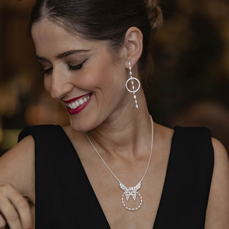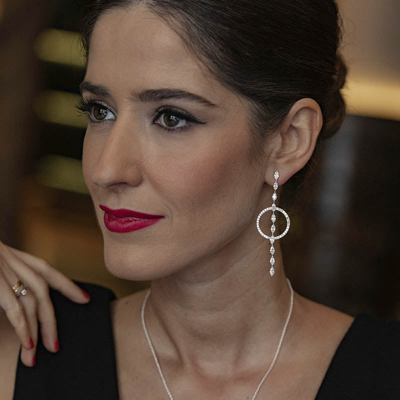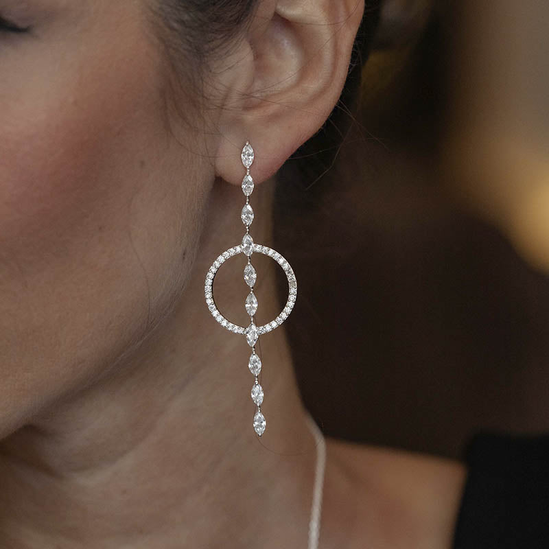 Pendientes en forma vertical con circonitas incrustadas. En medio, incluye un círculo también formado por cristales. Un modelo de corte super actual perfecto si quieres romper con las lineas clásicas de tus looks más especiales de invitada o para eventos. Atrévete con ellos también para looks más informales y aporta un toque de luz y brillo que no pasará desapercibido.