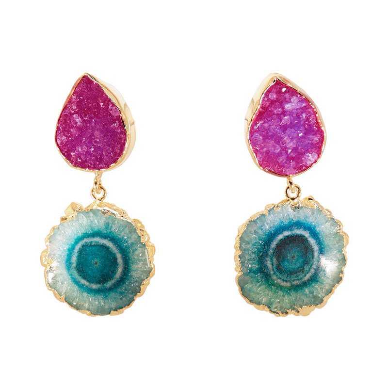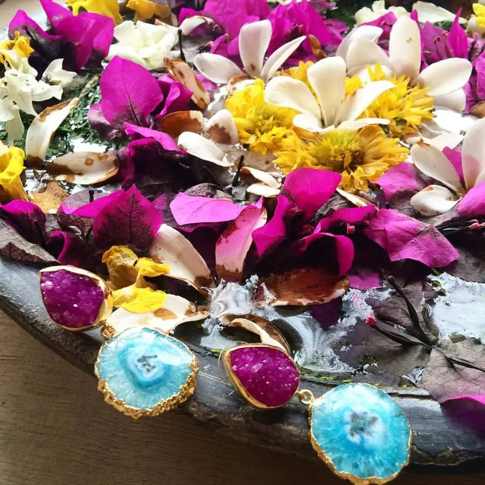 Pendientes formados por dos piedras: una en forma de gota y otra circular. Este diseño refleja la dedicación artesanal, destacando por su elegancia sutil y atemporal.