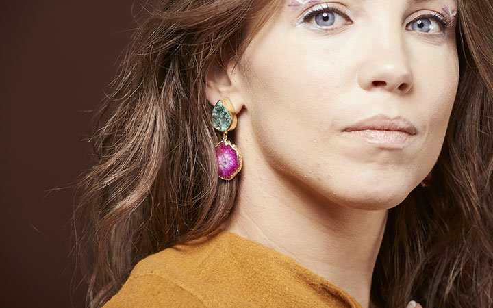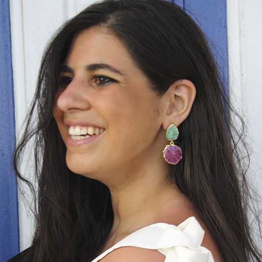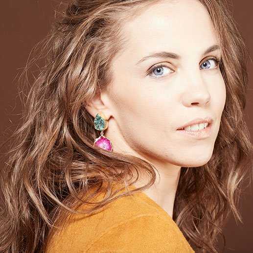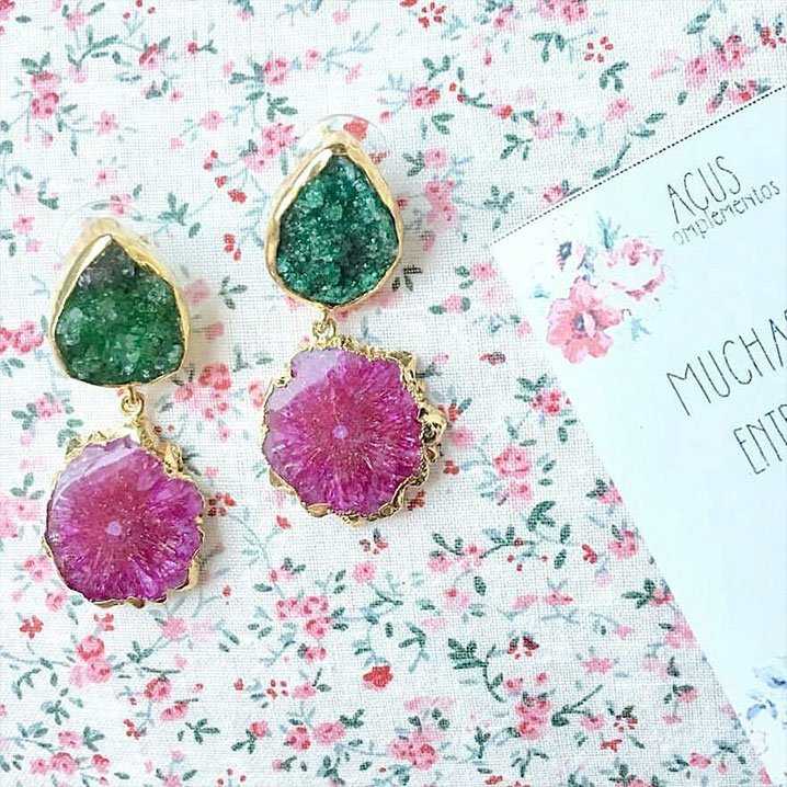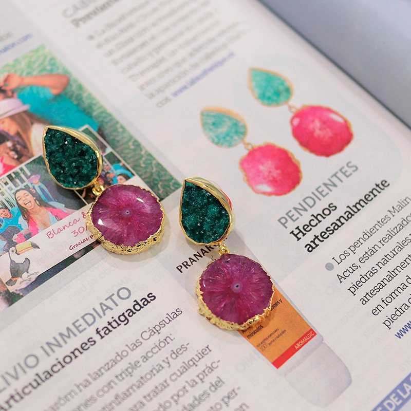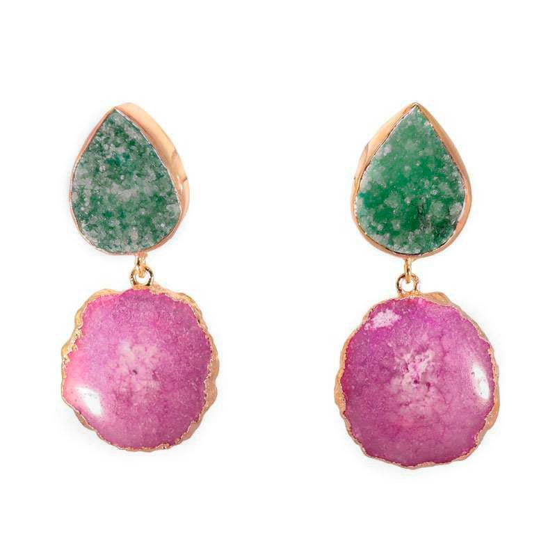 Pendientes formados por dos piedras: una en forma de gota y otra circular. Este diseño refleja la dedicación artesanal, destacando por su elegancia sutil y atemporal.