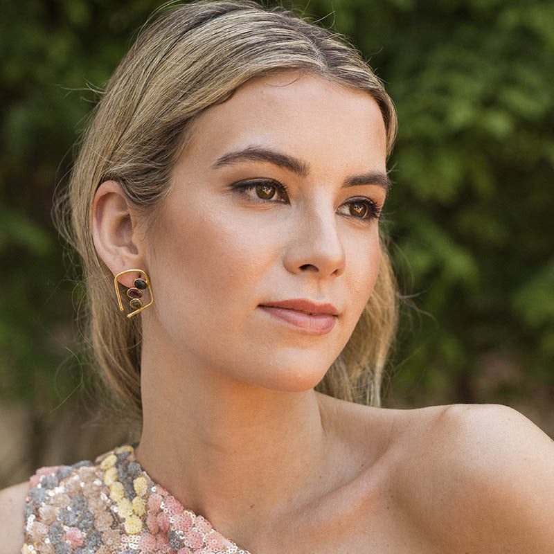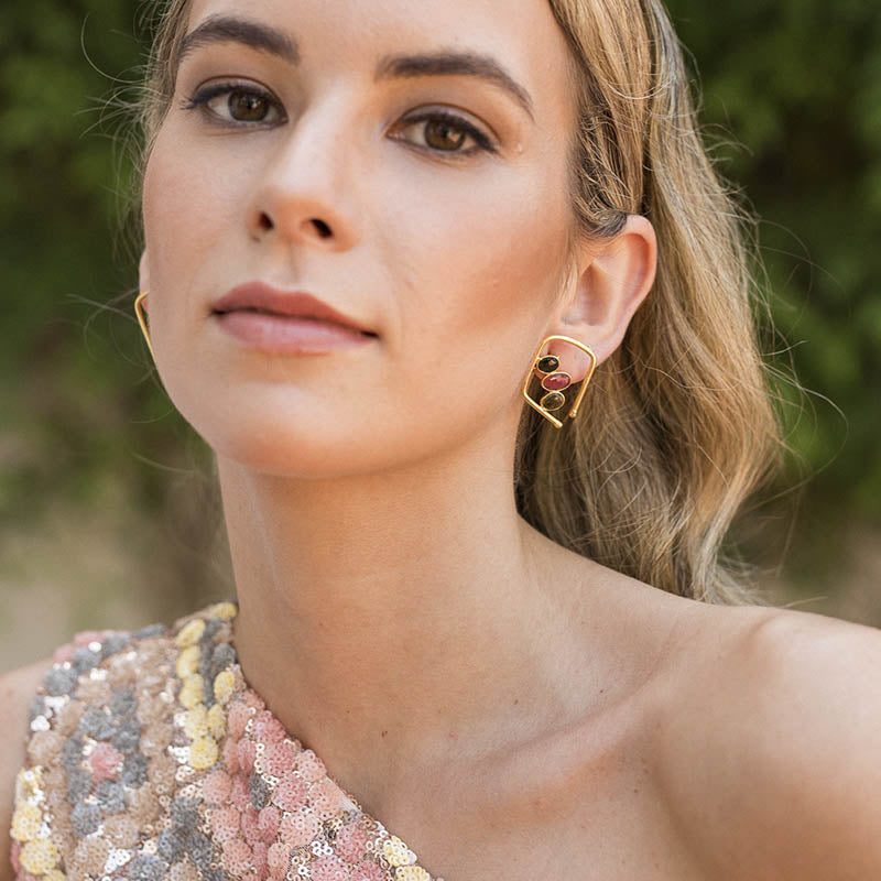 Pendientes con un arco sutil que alberga tres piedras dispuestas verticalmente en su interior. Este diseño armonioso crea una pieza que equilibra la simplicidad con la sofisticación, destacando tu estilo con un toque de gracia y originalidad.