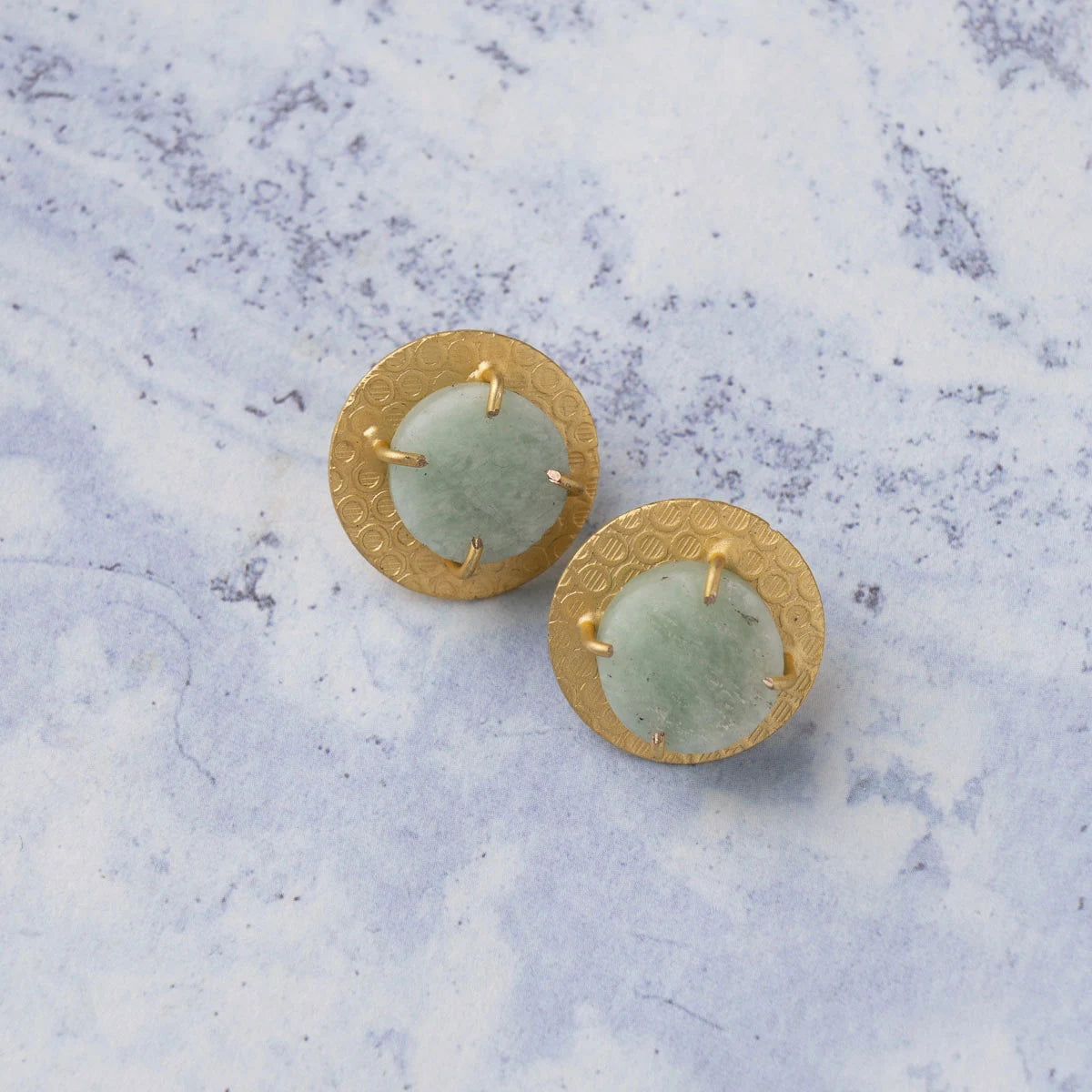 Un círculo dorado con relieve y una piedra en su centro define estos elegantes pendientes. Un diseño distintivo que añade un toque de sofisticación y encanto a tu estilo, destacando con elegancia en cualquier ocasión