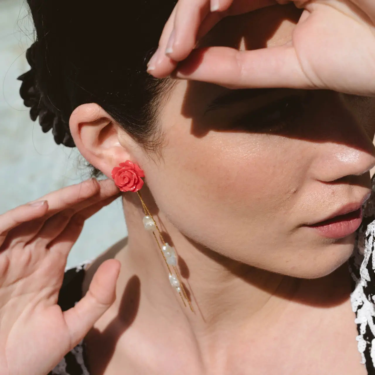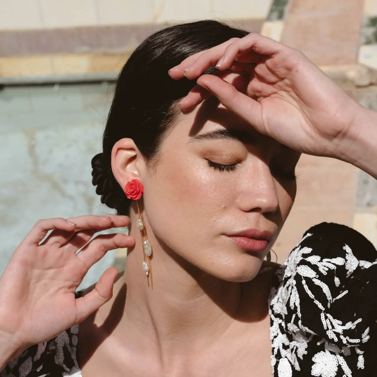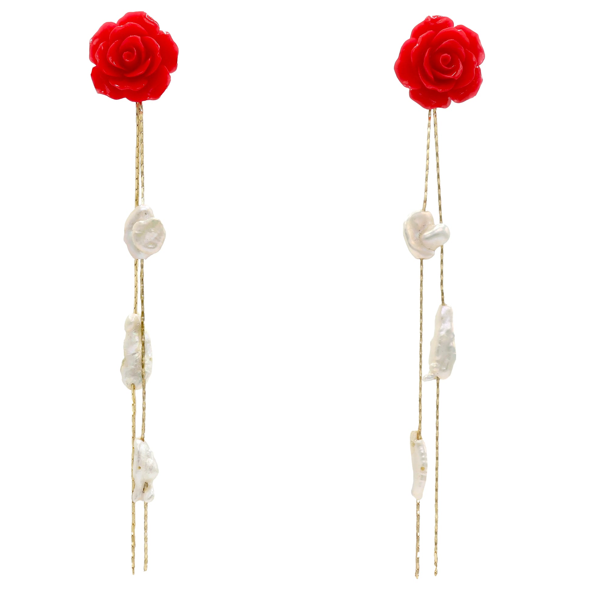 Estos pendientes destacan por su intrincado diseño de una rosa en relieve, que sirve de base para delicadas cadenas que se desprenden suavemente, creando un movimiento elegante y fluido. En estas, se sitúan varias perlas de forma alterna. La combinación de la flor detallada y las perlas aporta un contraste de texturas que convierte a estos pendientes en una pieza sofisticada y única, ideal para añadir un toque de feminidad y estilo a cualquier look.