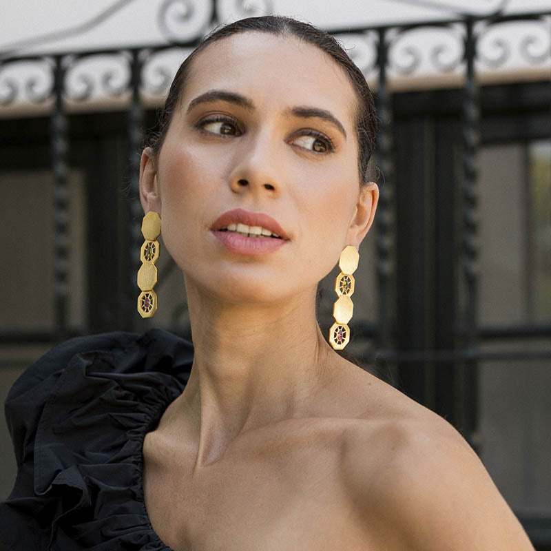 Descubre la armonía geométrica de estos pendientes únicos. Con múltiples bases interconectadas, dos de ellas destacan con una deslumbrante piedra en su corazón. Un accesorio moderno y elegante que resalta tu estilo con distinción.